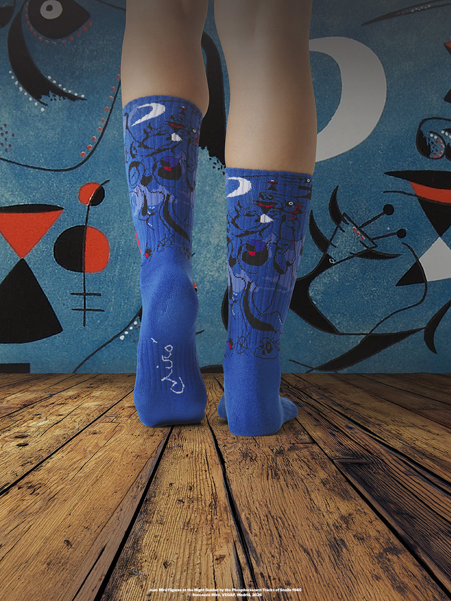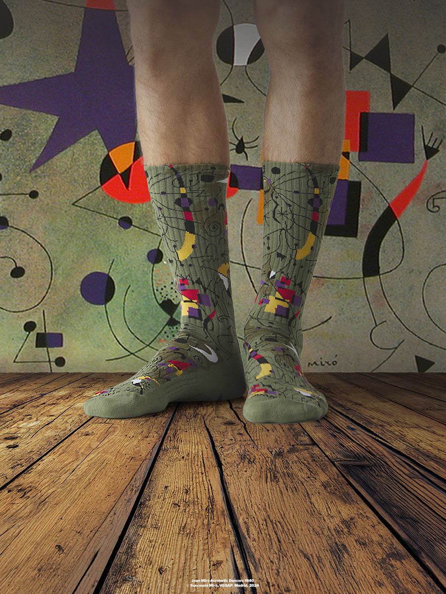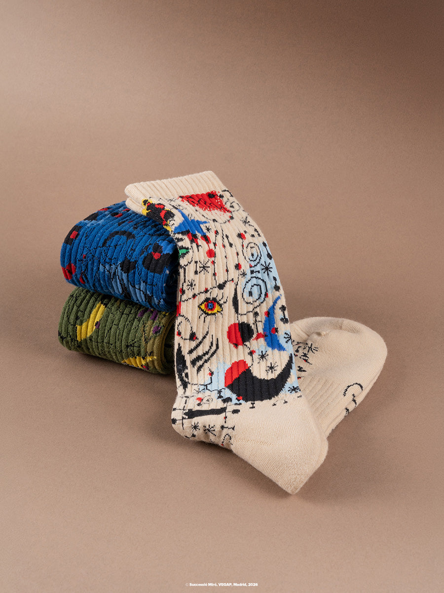 • 3 exclusive Athletic-style sock designs featuring Miró’s signature colors, symbols, and abstract forms.