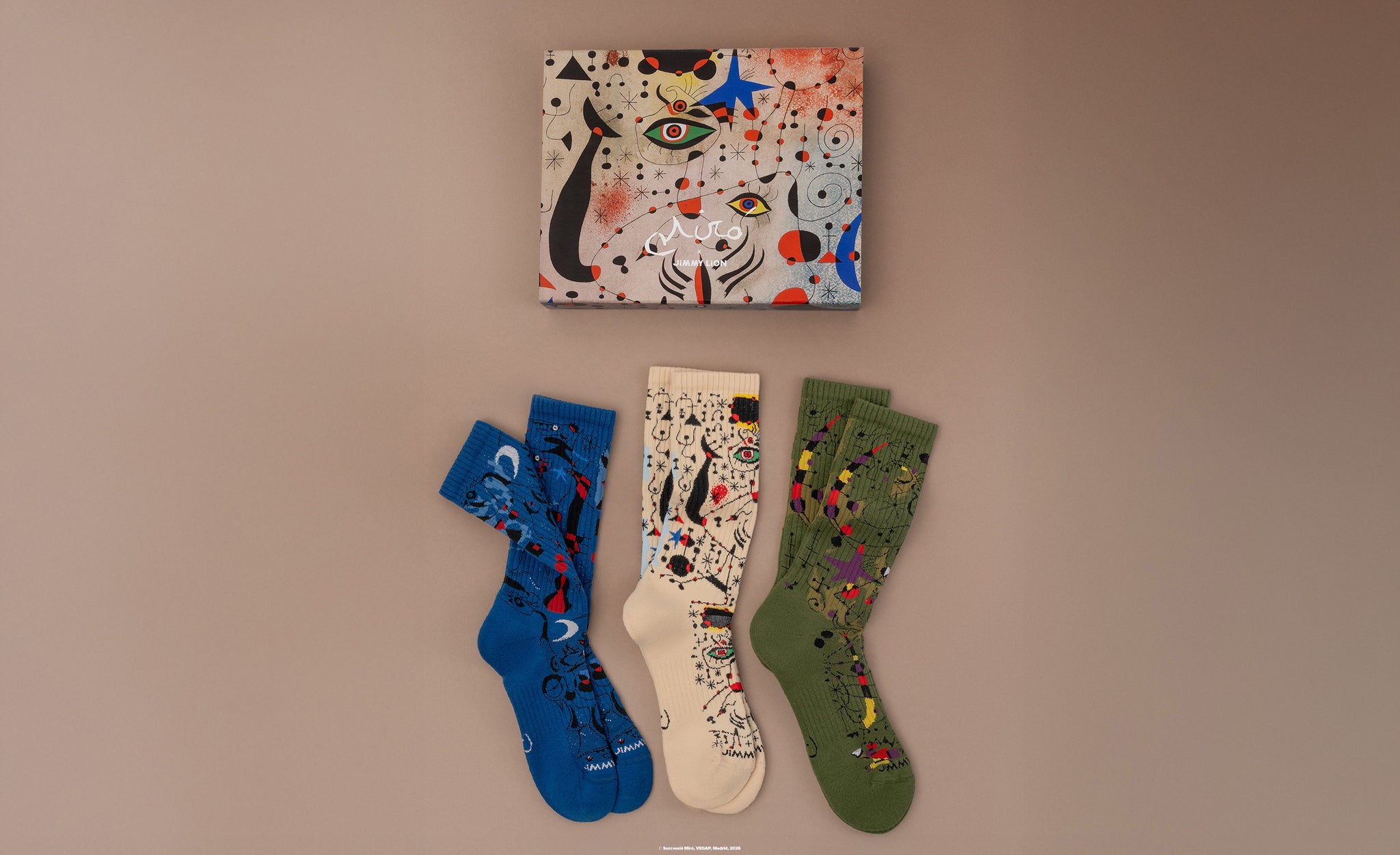 Discover the Miró x Jimmy Lion Collection — socks, tees, and a gift pack inspired by Joan Miró’s bold, pioneering art.